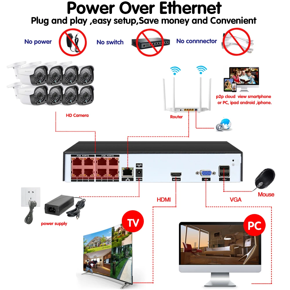 OVERVIEW Product Video Surveillance H.265 PoE NVR 4 8Channel For HD 1080P IP Camera PoE 4CH 8CH PoE NVR 4MP 5MP 48V